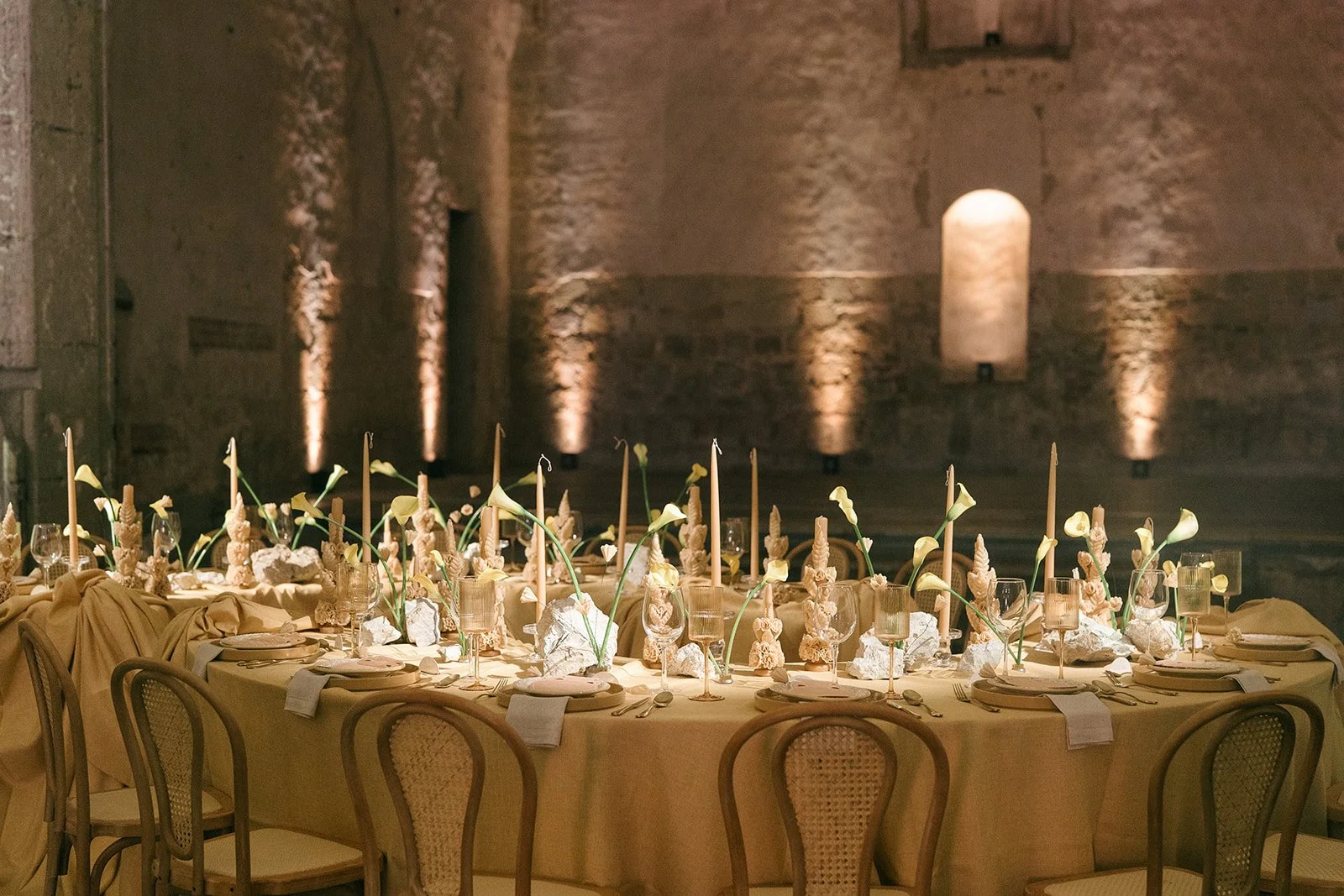 Una de las tendencias más importantes del 2026 es el diseño narrativo. Las bodas ya no se conciben como colecciones de elementos bonitos, sino como espacios que cuentan una historia con coherencia visual. Mesas serpenteantes que guían el recorrido, drapeados suspendidos que flotan como esculturas textiles, instalaciones florales monumentales que marcan el ritmo de la ceremonia o la recepción… todo se elige con intención. Los centros de mesa dejan de ser piezas aisladas y empiezan a interactuar con su entorno.